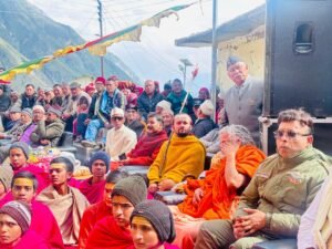 बदरीनाथ/ सोमवार। देश के प्रथम ग्राम मणिभद्र (माणा) में आयोजित त्रिदिवसीय जेठ पुजै में सोमवार को शङ्कराचार्य स्वामिश्रीः अविमुक्तेश्वरानंदः सरस्वती ‘१००८’ जी महाराज के शिष्य स्वामी प्रत्यक्चैतन्यमुकुन्दानन्द गिरि अतिथि के रूप में गांव पहुँचें , सबसे पहले श्री घण्टाकर्ण जी महाराज के दर्शन किया ।