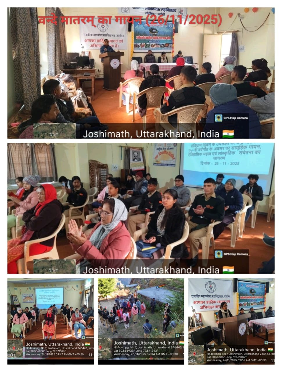 महाविद्यालय की प्राचार्य डॉ प्रीति कुमारी जी ने संविधान दिवस के बारे में जानकारी दी। उन्होंने भारतीय संविधान की ऐतिहासिकता एवं महत्व को रेखांकित किया साथ ही छात्र-छात्राओं को भारतीय संविधान की विशेषताओं एवं महत्ता के बारे में बताया । कार्यक्रम के नोडल अधिकारी श्री नवीन पंत जी, असिस्टेंट प्रोफेसर संस्कृत द्वारा बताया गया कि अथर्ववेद के पृथ्वी सूक्त में भूमि की वंदना की गई है जिससे यह गीत अभिप्रेत है।वंदे मातरम गायन एवं संविधान दिवस पर कार्यक्रम में महाविद्यालय के सभी प्राध्यापक, शिक्षणोत्तर कर्मचारी, छात्र संघ के पदाधिकारी, पूर्व छात्र संघ अध्यक्ष एवं छात्र-छात्राओं द्वारा वंदे मातरम गायन में प्रतिभाग किया गया। कार्यक्रम का संचालन नवीन पंत जी द्वारा किया गया।