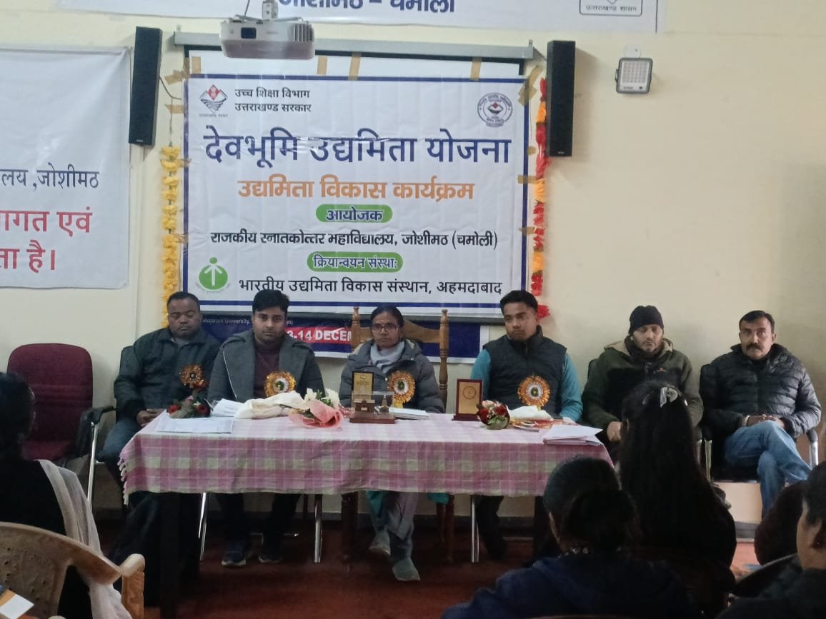 ज्योर्तिमठ। उत्तराखंड सरकार और राष्ट्रीय उद्यमिता विकास संस्थान अहमदाबाद के संयुक्त तत्वावधान में उत्तराखंड के युवाओं को स्वरोजगार और उद्यमशीलता की दृष्टि से सफल बनाने के लिए चलाई जा रही देवभूमि उद्यमिता योजना की बारह दिवसीय कार्यशाला का आज राजकीय महाविद्यालय जोशीमठ में उद्घाटन हुआ ।