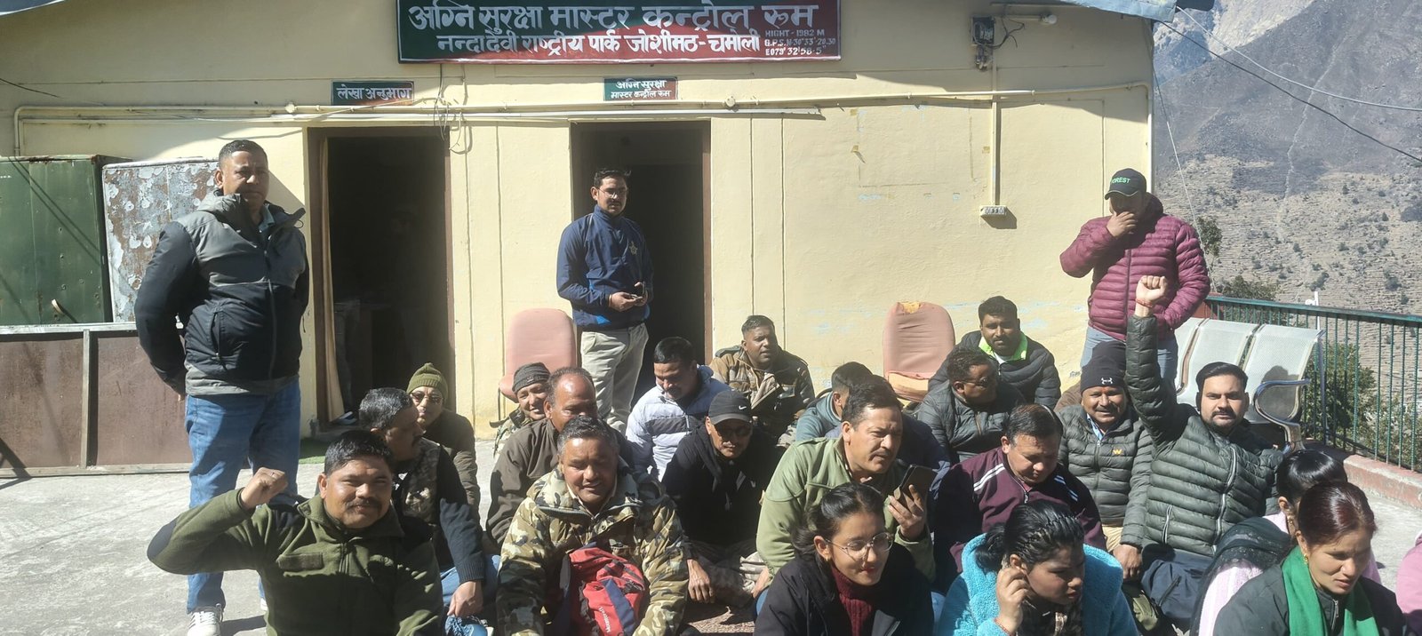 ज्योर्तिमठ। वन आरक्षी नंदा देवी राष्ट्रीय पार्क जोशीमठ के ज्योर्तिमठ रेंज एवं फूलों की घाटी के सभी वन कर्मियों ने आज दूसरे दिन भी अपनी लंबित 6 सूत्रीय मांग को लेकर प्रभागीय कार्यालय नंदा देवी राष्ट्रीय पार्क ज्योर्तिमठ में शांतिपूर्ण रूप से धरना प्रदर्शन एवं कार्यबहिष्कार किया। वन कर्मियों का कहना है कि जब तक उनकी लंबित 6 सूूूत्रीय मांगे पूरी नहीं होती है । तक अनिश्चितकालीन धरना प्रदर्शन एवं कार्य बहिष्कार किया जाएगा।