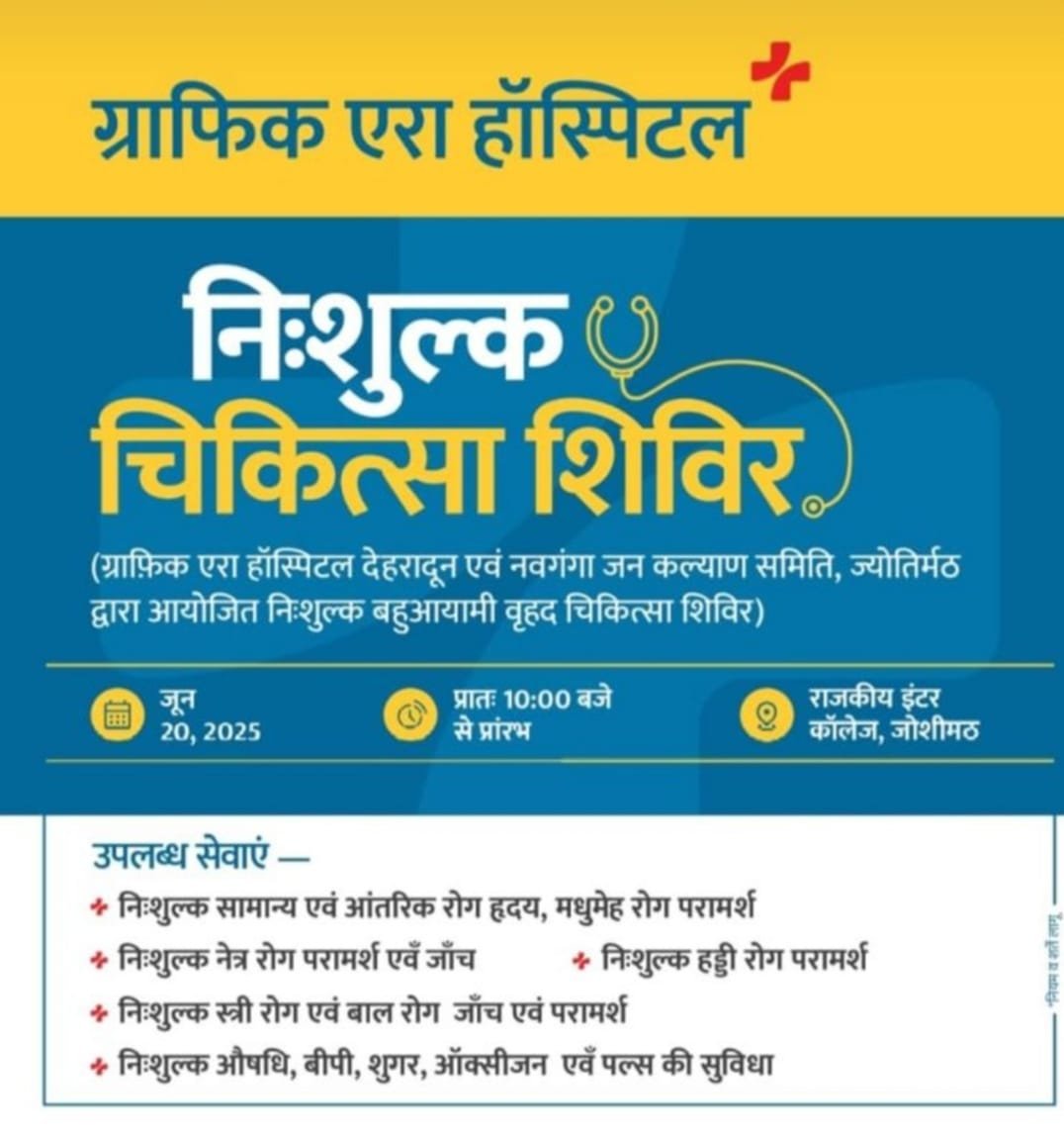 ग्राफिक एरा हॉस्पिटल देहरादून एवं नव गंगा जन कल्याण समिति द्वारा संयुक्त रूप से ज्योतिर्मठ में लगेगा विशाल निशुल्क चिकित्सा शिविर