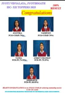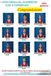 ज्योतिर्मठ। ज्योति विद्यालय ज्योर्तिमठ में आज दिनांक 30.4.25 को ICSE के कक्षा दसवीं और आईएससी के कक्षा 12वीं के परीक्षा परिणाम घोषित हुए। जिसमें कक्षा दसवीं में कुल 49 छात्र छात्राएं सम्मिलित हुए थे, तथा कक्षा 12वीं में कुल 9 छात्र छात्राएं सम्मिलित हुए थे। विद्यालय का परीक्षा परिणाम शत प्रतिशत रहा।
