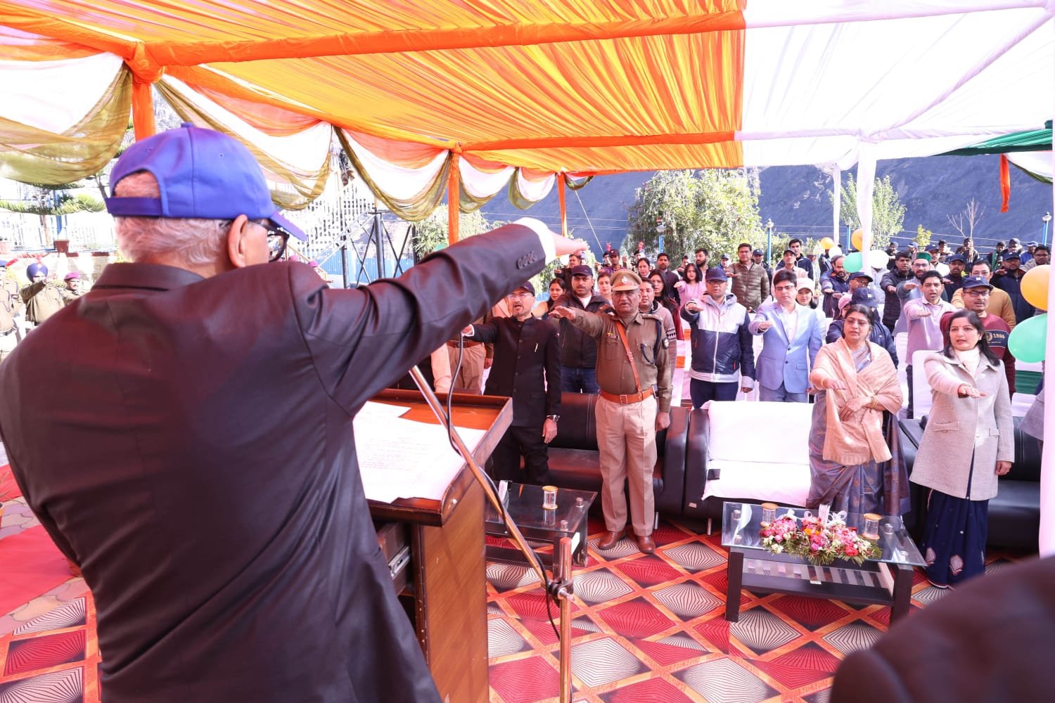 ज्योर्तिमठ। तपोवन विष्णुगाड हाइड्रो पावर प्रोजेक्ट में गणतन्त्र दिवस का राष्ट्रिय पर्व बड़े हर्षोल्लास के साथ मनाया गया। मुख्य महाप्रबंधक पी ए पांडे के द्वारका ध्वज प्राचीर पर राष्ट्रिय ध्वज फहराकर कार्यक्रम का आरंभ हुआ। अलकनंदा महिला समिति की सदस्याओं एवं कर्मचारियों द्वारा राष्ट्रगान एवं एनटीपीसी गीत का भव्य गायन किया गया। राष्ट्रगान की गूंज के साथ साथ मेकेनिकल विभाग की फायर विंग द्वारा पानी से तिरंगे की छवि बना कर इस कार्यक्रम को अति रमणीक बना दिया।