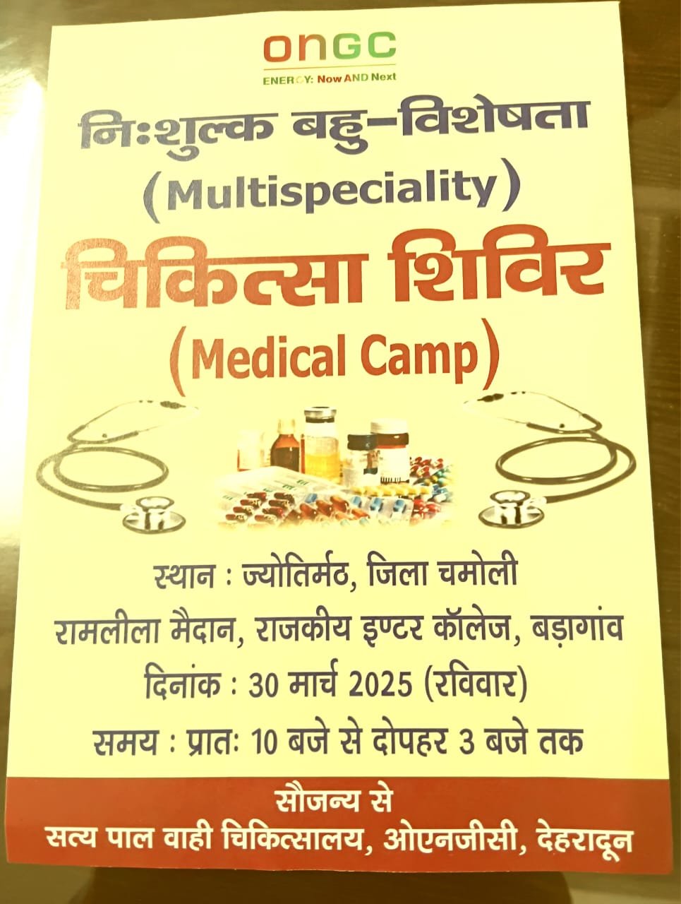 ज्योतिर्मठ /बड़ागांव। 30 मार्च रविवार को नवरत्न संस्थान ONGC हॉस्पिटल देहरादून के मुख्य चिकित्सा सेवा डॉ पीत वसन, प्रमुख चिकित्सा सेवा डॉ विकास लोईवाल के अमूल्य प्रयास से पहाड़ वासियों की पीड़ा समझते हुए उत्तराखंड के सीमावर्ती जिला – चमोली के ज्योर्तिमठ नगर क्षेत्र के गांव बड़ागांव राजकीय राजकीय इंटर कालेज में एक विशाल निःशुल्क चिकित्सा शिविर का आयोजन किया जा रहा है, जिसमें प्रमुखरूप से हृदय रोग विशेषज्ञ , काय चिकित्सा, बाल रोग विशेषज्ञ, स्त्री रोग विशेषज्ञ, ऑर्थोडॉक्स सर्जन, दंत रोग चिकित्सा आदि सभी प्रकार के विशेषज्ञ डॉक्टर मौजूद रहेंगे। और निशुल्क दवा वितरण की जाएगी। साथ ही ECG, खून जांच, नेत्र रोग चिकित्सा आदि की जांच pharmaceutical उपकरण की व्यवस्था रहेगी।