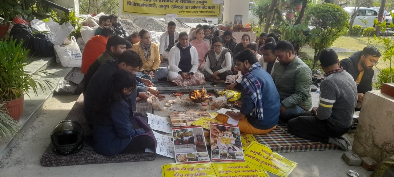 देहरादून: अपनी नियुक्ति के लिए आयुष निदेशालय में पिछले करीब 12 दिनों से धरने पर डटे चयनित आयुष चिकित्सा अधिकारियों का प्रदर्शन तेज होने लगा है। चयनित आयुष के चिकित्सा अधिकारी लगातार शांतिपूर्ण धरना-प्रदर्शन कर रहे हैं। इसके तहत आज निदेशालय में सरकार की बुद्धि-शुद्धि के लिए यज्ञ किया गया।